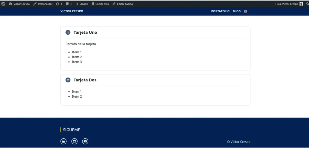 Este bloque permite insertar contenido directamente desde el editor de WordPress manteniendo el diseño establecido en el tema. Dentro de la tarjeta, los editores pueden agregar distintos tipos de bloques como párrafos y listas, lo que les da flexibilidad para estructurar el contenido sin alterar la apariencia visual del componente.